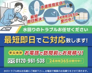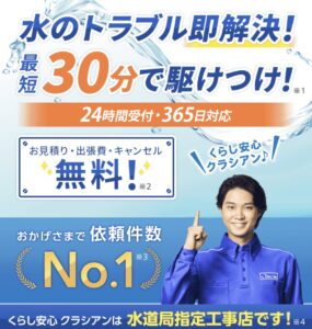 24時間対応ではないため、深夜にどうしても修理を依頼したい場合は、クラシアンや水110番(全国対応)、カンスイ(関東エリア)など深夜対応もできる業者がお勧めです。
